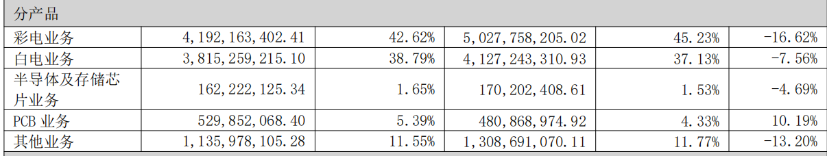 分板块来看,康佳的六个业务中,五个出现收入下滑。其中,收入占比最大的彩电业务2025年收入下降幅度为16.62%,白电收入下降幅度为7.56%,半导体及存储芯片业务收入下降幅度为4.69%,其他业务收入下降幅度为13.20%,只有PCB(印制电路板)业务实现了10.19%的增长。