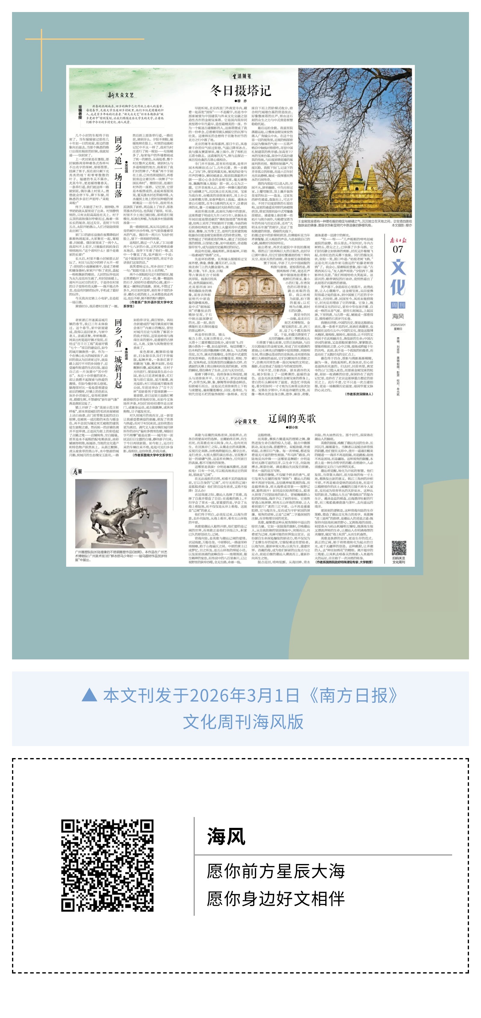 新春的热闹尚在,回乡的脚步已化作纸上动人的篇章。每逢春节,无数大学生返回乡村故里,他们不仅是团圆的归人,也是家乡年味的记录者。“新大众文艺”栏目本期推出“故乡更新中”特别策划,让我们跟随这些大学生的文字,去看他们眼中今日的乡村变化、动人风景。
