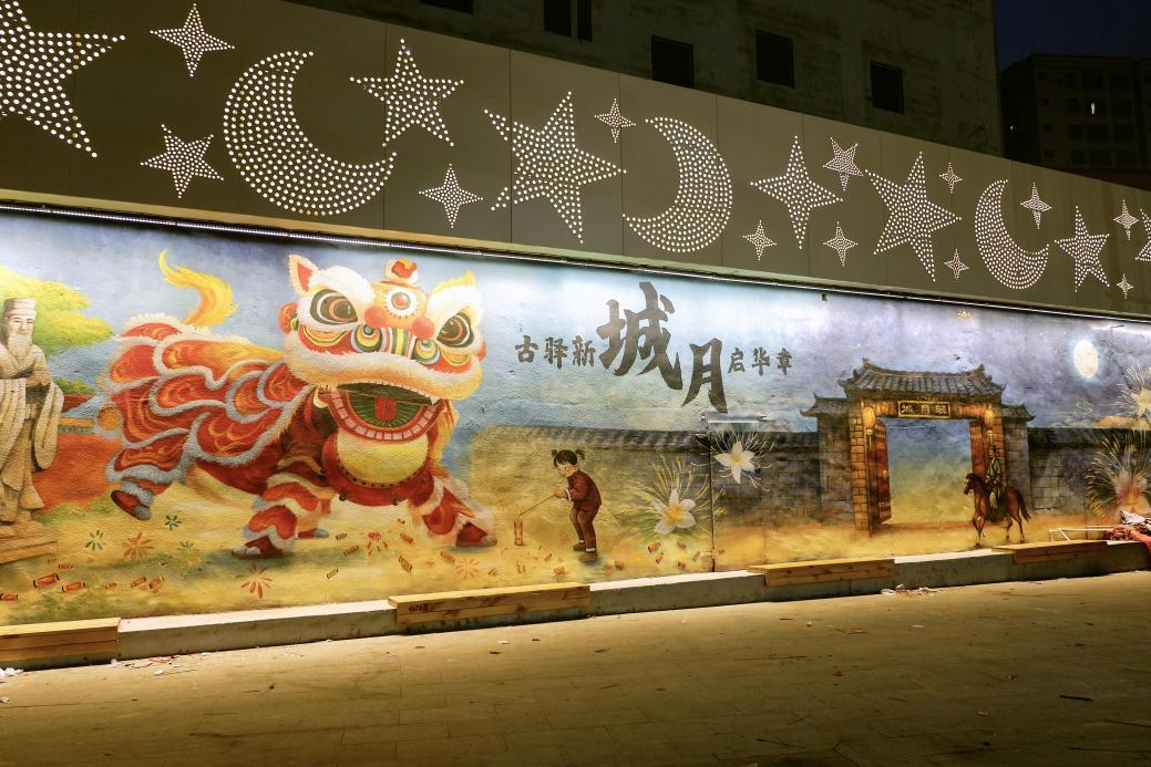 “古驿新城月”主题彩绘墙,醒狮、古驿等元素跃然墙上,尽显地方文脉与时代新貌。