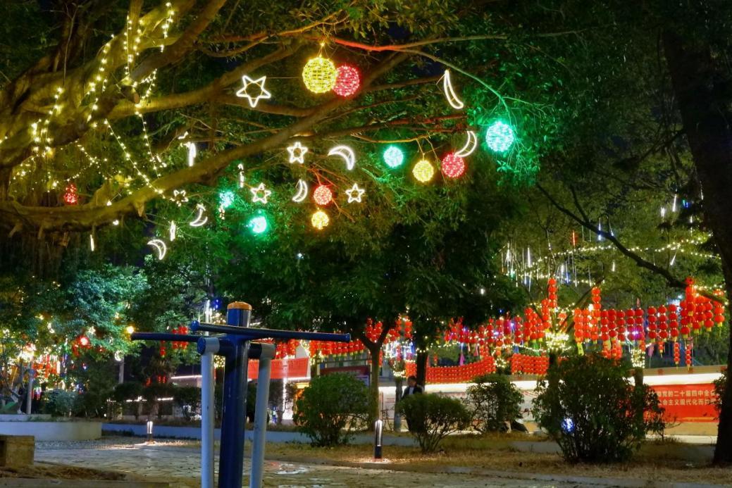 城月镇绿美生态小公园,彩灯与红灯笼交织,点亮了村民的夜生活。