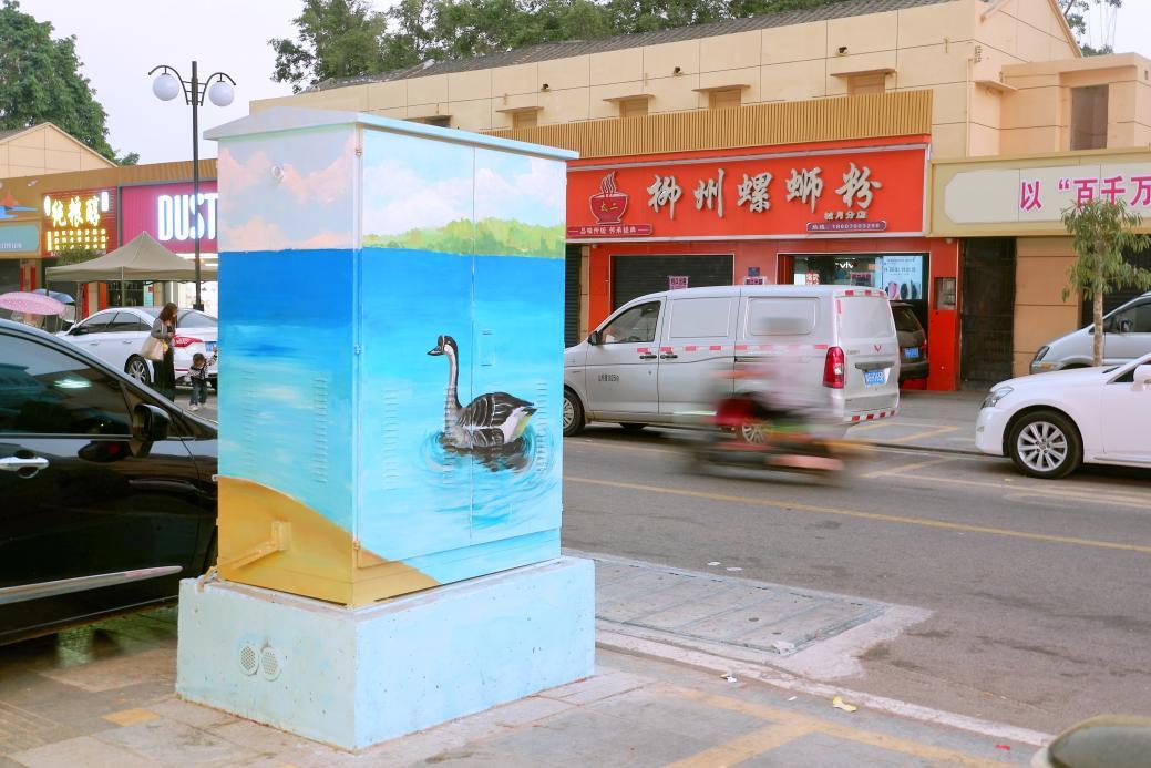 城月镇朝阳路,配电箱被绘上“城月鹅”图案,与圩镇新貌相映成趣。