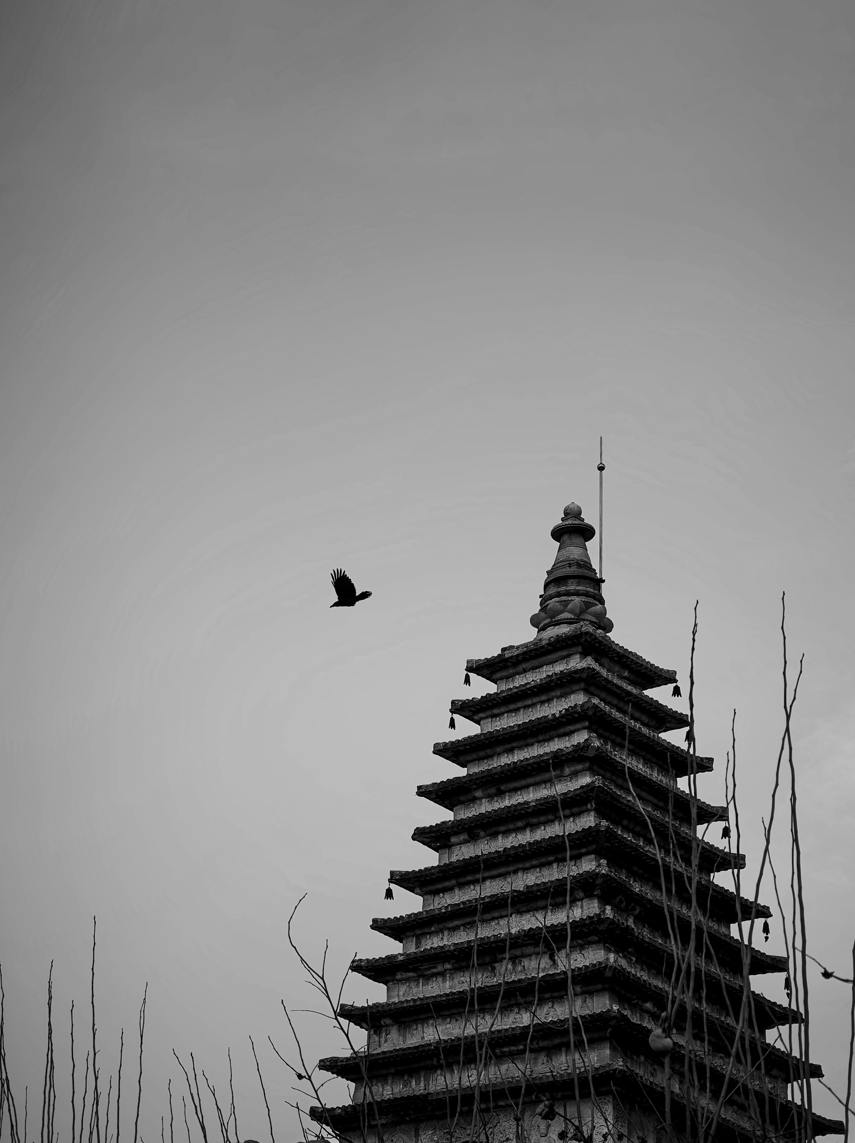“呀——呀——”几声粗粝的啼鸣划破庭院的寂静。抬头望去,不知何时,寺内古树梢头、塔尖之上,已停落了许多乌鸦。它们时而静立如铁铸的剪影,时而又扑棱棱飞起,在绯红色的天幕下盘旋。同行的摄友见状,轻轻一笑,脱口吟道:“枯枝老树飞鸦。”这是化用元曲作家马致远的“枯藤老树昏鸦”了。我会心,望着眼前景象,接口道:“古塔西风石马。”友人朗声再续:“夕阳西下,摄影师在天涯。”我们相视哈哈大笑起来。这即兴的、略带调侃的打油诗,竟悄然道出了此刻苍茫而豁然的意境。