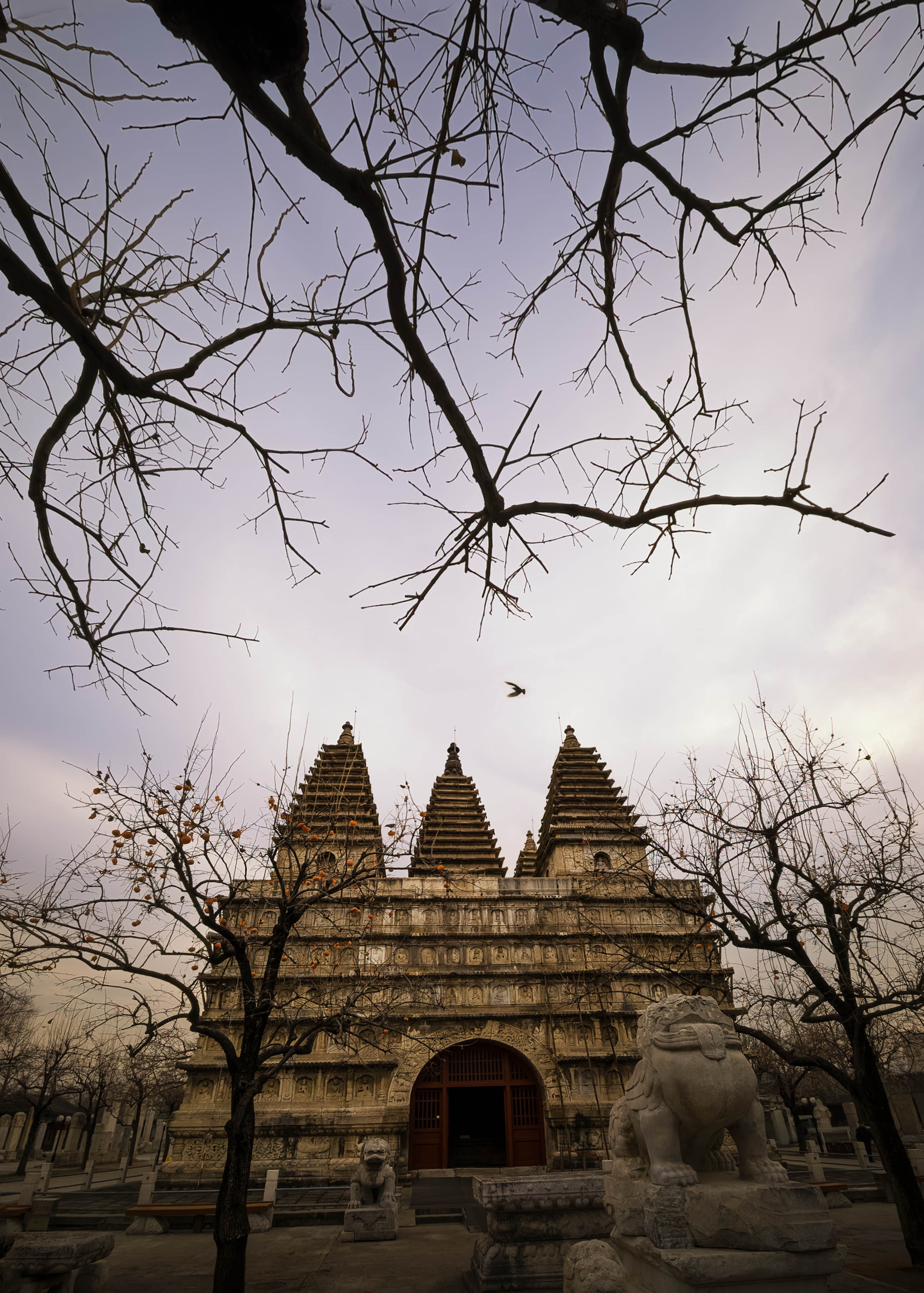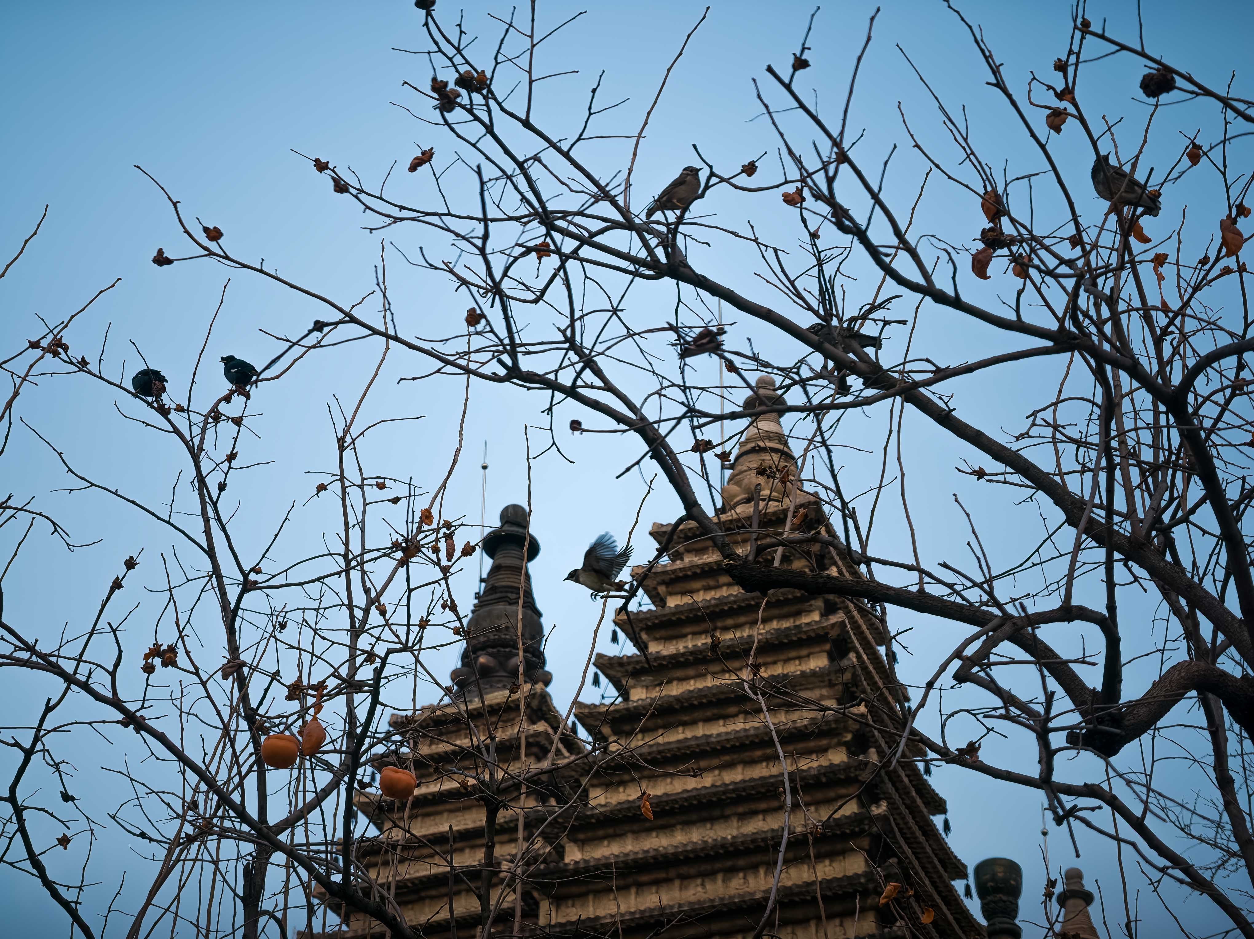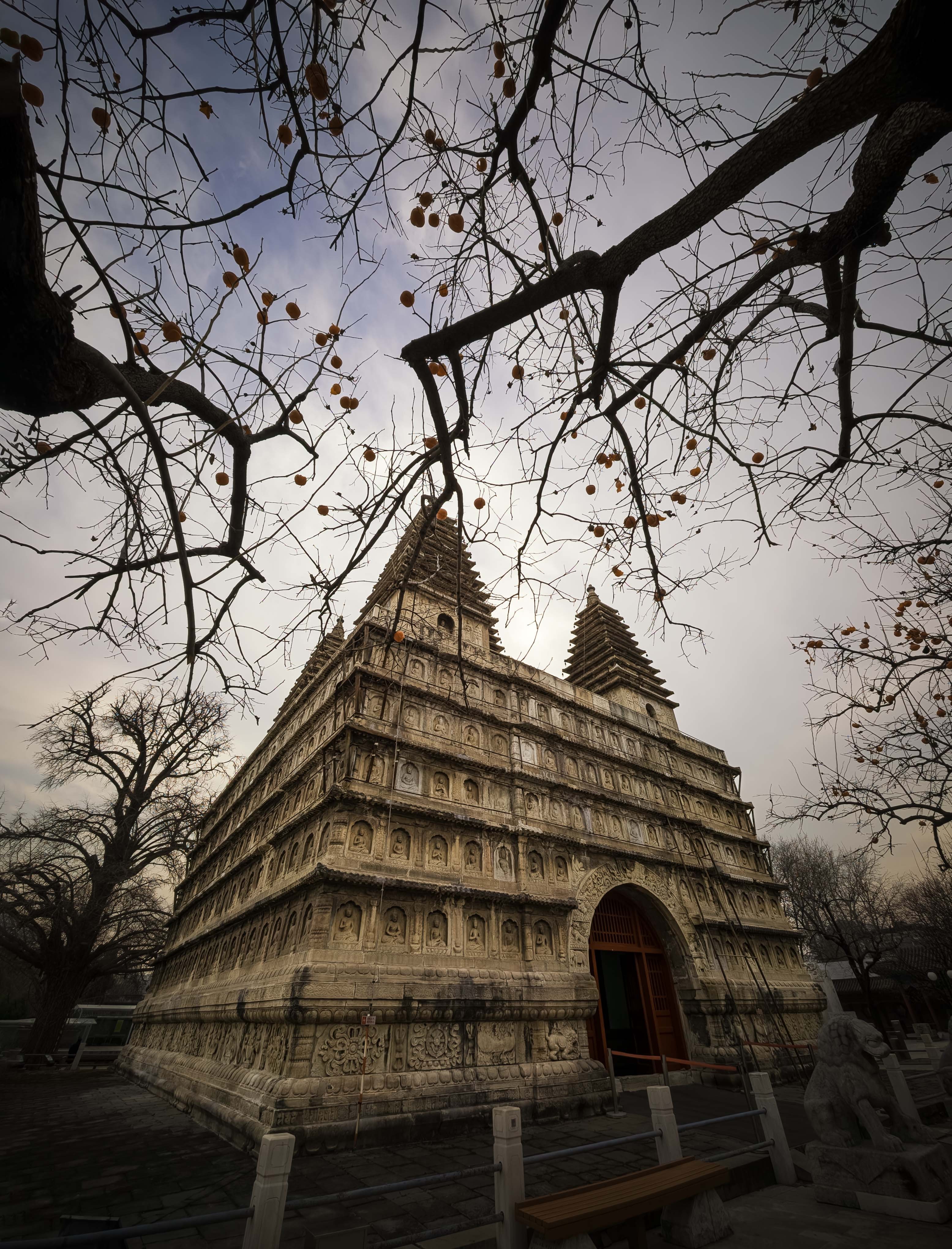 退出塔室,再次在庭院中寻找拍摄视角。塔的正门前两株巨大的古银杏,此时早已黄叶落尽,但它们那纷繁遒劲的枝丫伸向天空,宛如天然的画框,将金刚宝座稳稳地置于其间,平添了几分中国画般的构图与意境。更惊喜的是,塔侧两株柿子树,竟还在严寒中倔强地挂着数十枚鲜红的果实,像小小的灯笼,在青灰色的石塔背景上跳出亮眼的色彩。我以枯枝为前景,拍下塔的挺拔;以红柿为点缀,映衬石的沉静。