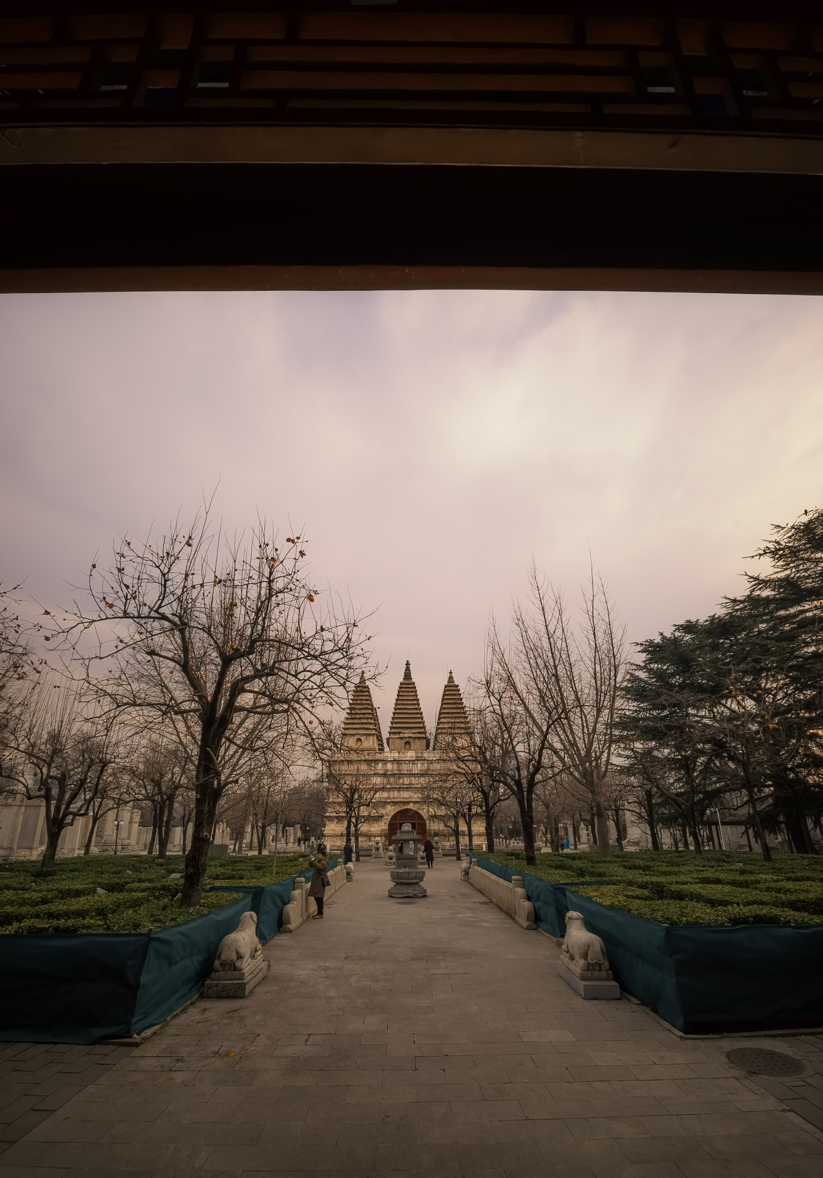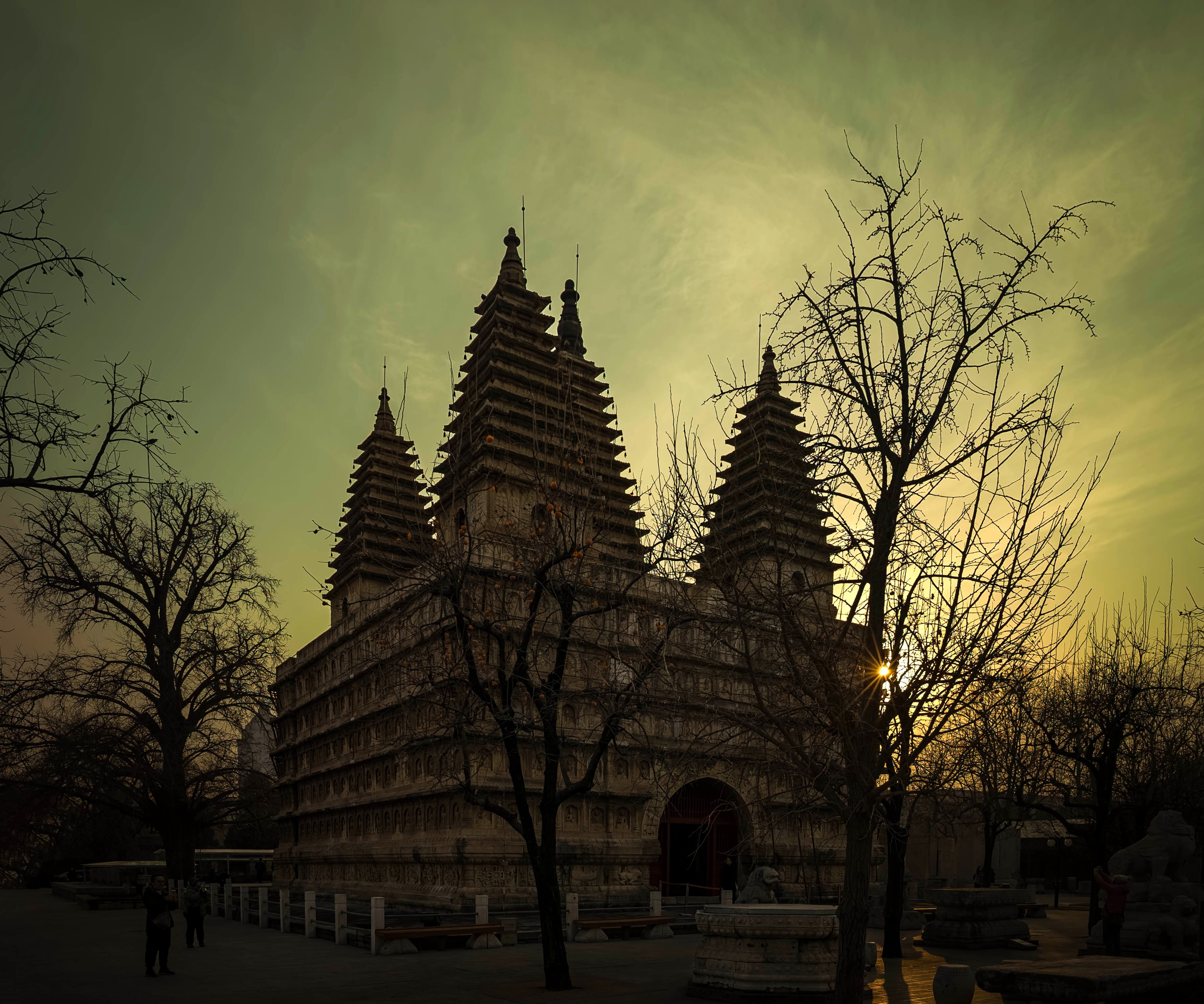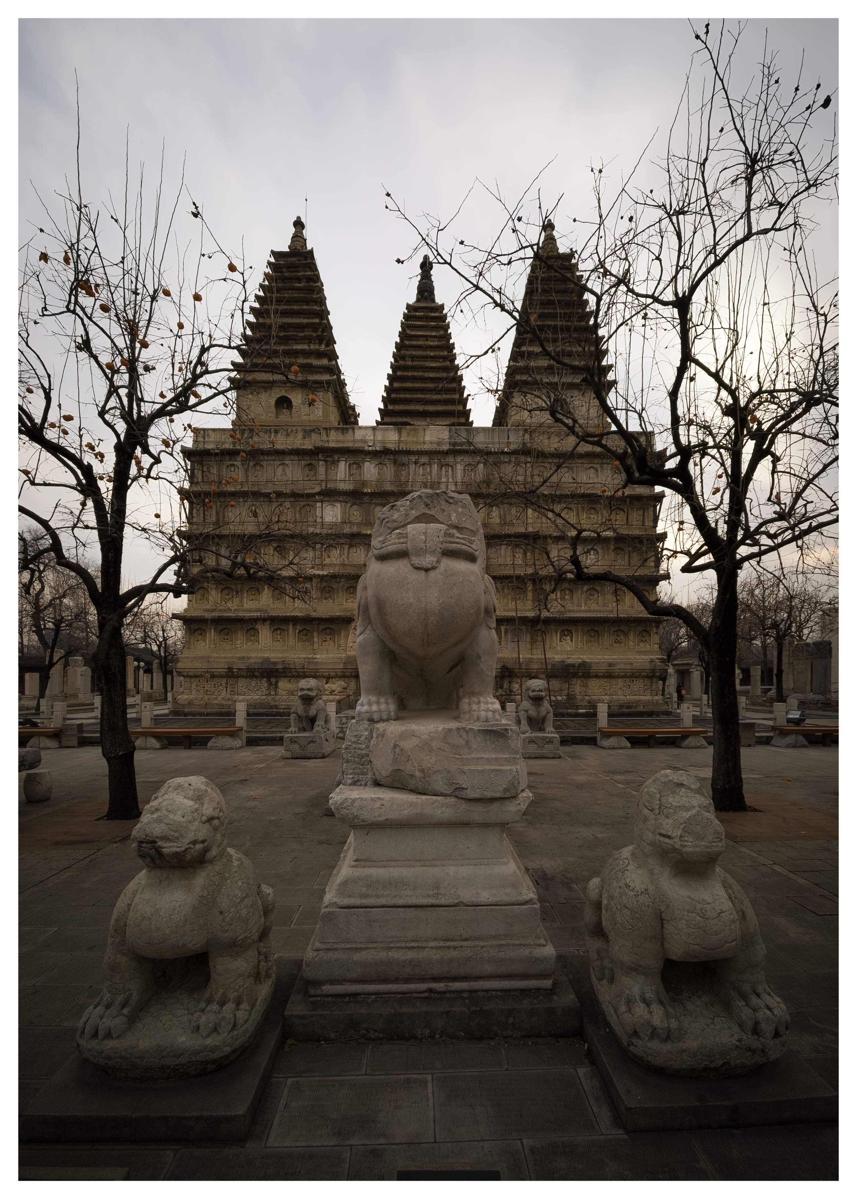 退出塔室,再次在庭院中寻找拍摄视角。塔的正门前两株巨大的古银杏,此时早已黄叶落尽,但它们那纷繁遒劲的枝丫伸向天空,宛如天然的画框,将金刚宝座稳稳地置于其间,平添了几分中国画般的构图与意境。更惊喜的是,塔侧两株柿子树,竟还在严寒中倔强地挂着数十枚鲜红的果实,像小小的灯笼,在青灰色的石塔背景上跳出亮眼的色彩。我以枯枝为前景,拍下塔的挺拔;以红柿为点缀,映衬石的沉静。
