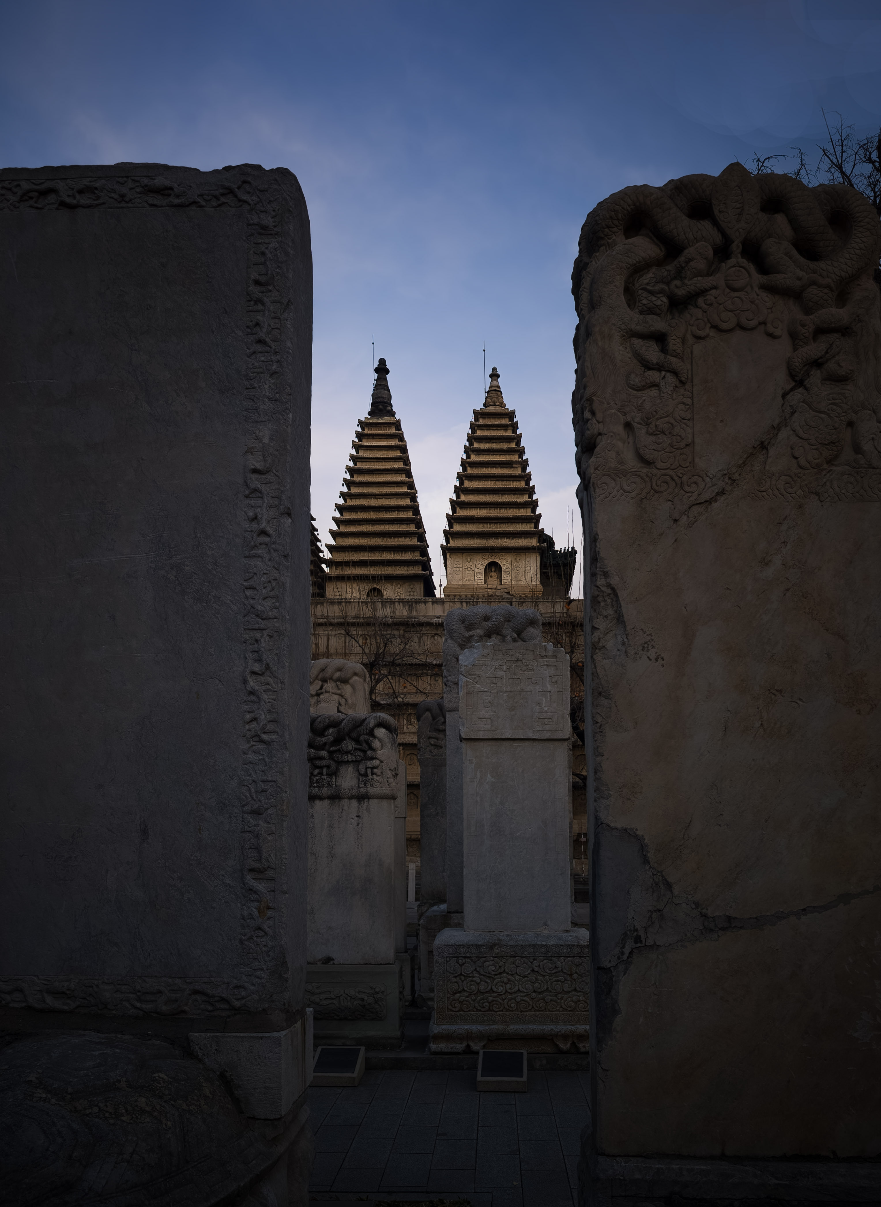 真觉寺的另一功能,是北京石刻艺术博物馆。金刚宝座的东、北、西三面,设了七个露天陈列区。于是,拍摄古塔便有了无穷的趣味:我将三尊明清无头石兽置于镜头前景,它的古拙残缺,与后方沉稳端庄的金刚宝座,形成了时光错落的意境;让石碑夹出的缝隙中显现塔影,明暗相生间,带出静远苍凉的历史纵深;还有那些驮着巨大碑刻的赑屃,它们沉默地伏在塔影之下,仿佛共同背负着一段沉甸甸的文明史。摄影,在这里成了连接古今的视觉纽带。