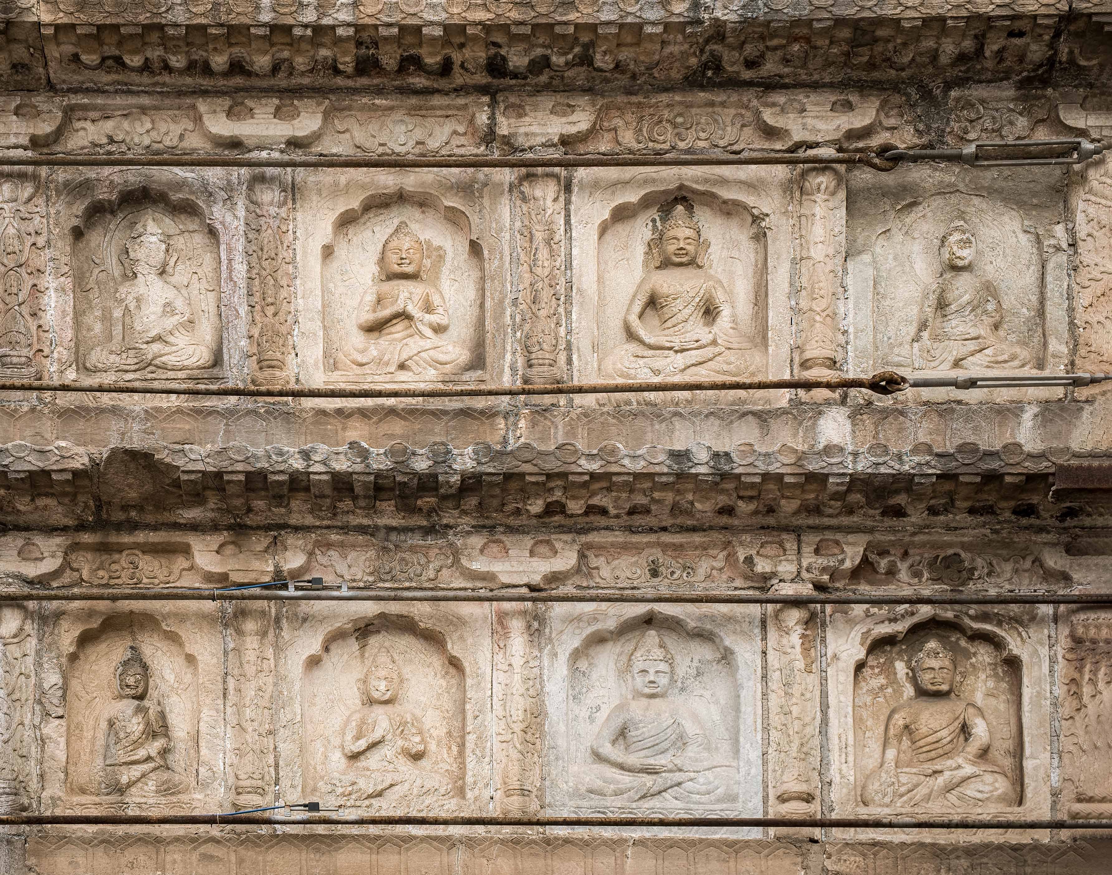 先是环拍塔壁。长焦镜头缓缓掠过宝座外壁,佛龛、佛像、雕花石栏,以及南北券门上的大鹏金翅鸟、座狮、巨象、飞羊、龙女、巨鲸等六拏具在方寸间渐次浮现。线条历经风雨,依然圆融如初,尤其那四面381尊结跏趺坐的佛像,面容衣饰彰显明代中原造像的静穆风格,是中式“剔地起突”浮雕技法的精妙呈现,于石中映出温润静定的光,那一刻,我仿佛能听见石隙间漫溢的悠远禅声。