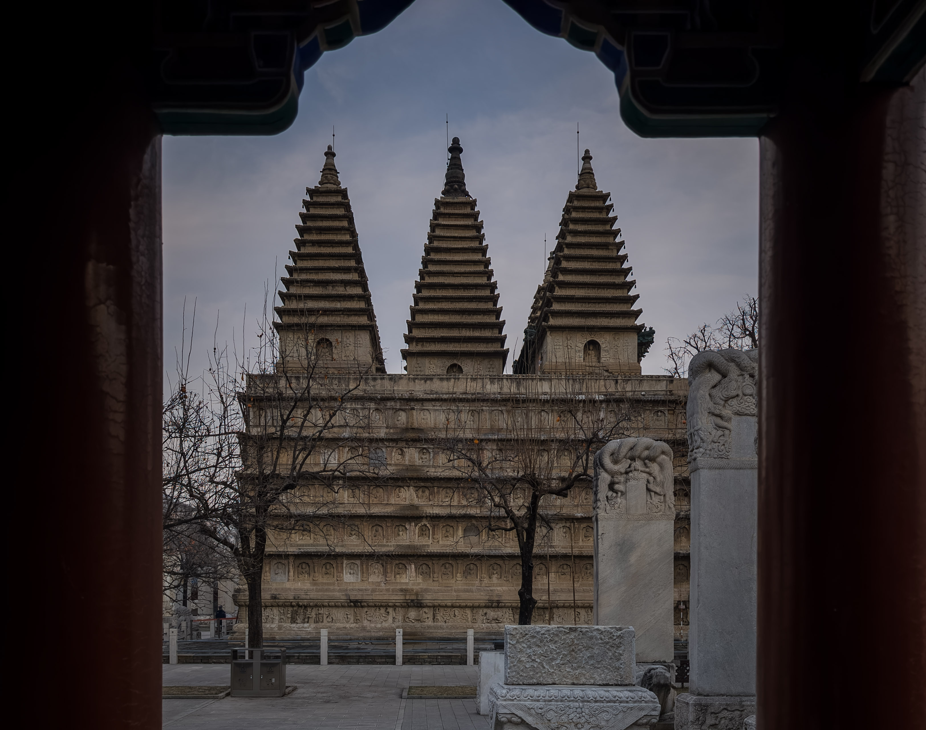 寺门并不张扬,甚至有些低调,是单开间木构牌坊式山门,古朴沉着。然一步踏入,门内门外,便觉两重天地,寒风的砭骨与市声的嘈杂,瞬间被滤去,眼前院落豁然开朗——那心心念念的金刚宝座,毫无铺垫地、巍巍然撞入视线!那一刹,心头为之一震。它并非高耸入云,却有一种磐石般的稳定与磅礴之气,沉沉地立在天地之间。宝座为高台形,由精美的须弥座承托,其上分立五座密檐方塔,如春笋般向上拔起。通体由青白石砌筑,在冬日清冽的天光下,泛着润泽的光,像一方被漫长时光轻养的古砚。